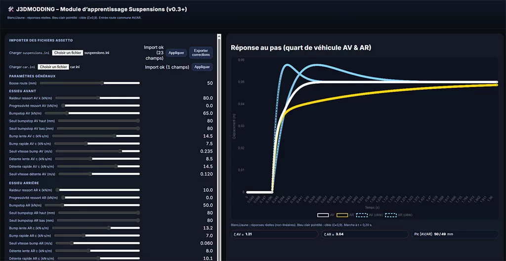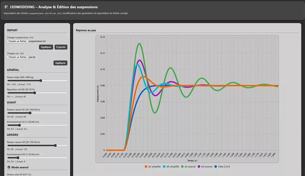 Le studio J3DMODDING a été développé son application SUSPENSION pour permettre une analyse directe des réponses dynamiques d’un essieu avant et arrière soumis à une excitation type “bosse de route”. Cet outil permet de comparer la réponse simulée d’un modèle simplifié avec un modèle avancé intégrant des paramètres additionnels de conception. La courbe de référence correspond à un amortissement critique visé, avec un coefficient d’amortissement réduit à ζ ≈ 0,9. L’application a été complétée par la suite avec la possibilité de charger des fichiers de suspensions de n’importe quel véhicule, de les modifier visuellement et de les exporter.