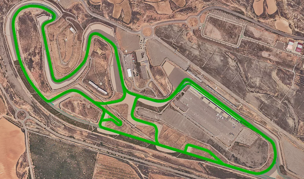 Inauguré en 2009, le circuit Motorland Aragón est un complexe unique qui rassemble un circuit international, une piste de karting, une zone off-road et un centre technologique. Son tracé principal, long de 5078 mètres, se caractérise par un enchaînement de courbes rapides, de virages aveugles, de zones de freinage complexes et de forts dévers. Il offre un terrain idéal pour étudier la dynamique du véhicule : les secteurs à haute vitesse favorisent le travail aérodynamique, les changements d’appuis rapides entre les virages 7, 8 et 9 sollicitent la précision du châssis, les longues courbes en appui permettent d’analyser le grip latéral, et les montées suivies de descentes influencent directement la stabilité au freinage. Conçu par Hermann Tilke en collaboration avec Pedro de la Rosa, le circuit est reconnu pour sa fluidité, sa technicité et la variété de situations qu’il impose aux pilotes comme aux ingénieurs.