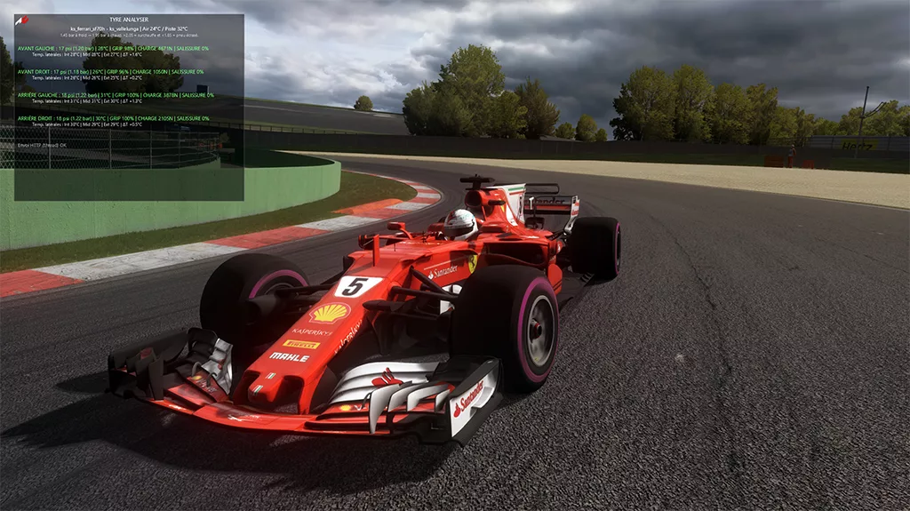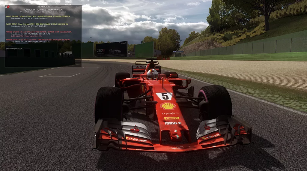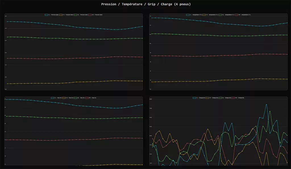 Notre application Tyre Analyser comporte deux modules : Le premier, en Python, lit via la mémoire partagée les données pneus en temps réel (température interne, pression, charge, salissure) ainsi que les informations de session. Ces valeurs, collectées à 60 Hz, sont normalisées puis envoyées à un serveur local. Le second module est un tableau de bord en HTML/JavaScript affichant quatre graphiques, un par pneu, montrant l’évolution du grip et de la température sur le tour en cours. Les courbes se mettent à jour en continu, sans latence, grâce à la communication locale entre les deux modules. À terme, l’objectif est de construire un modèle prédictif : un pneu virtuel dont le grip évolue selon la température, la charge et la distance, comme dans un logiciel d’ingénierie réelle.