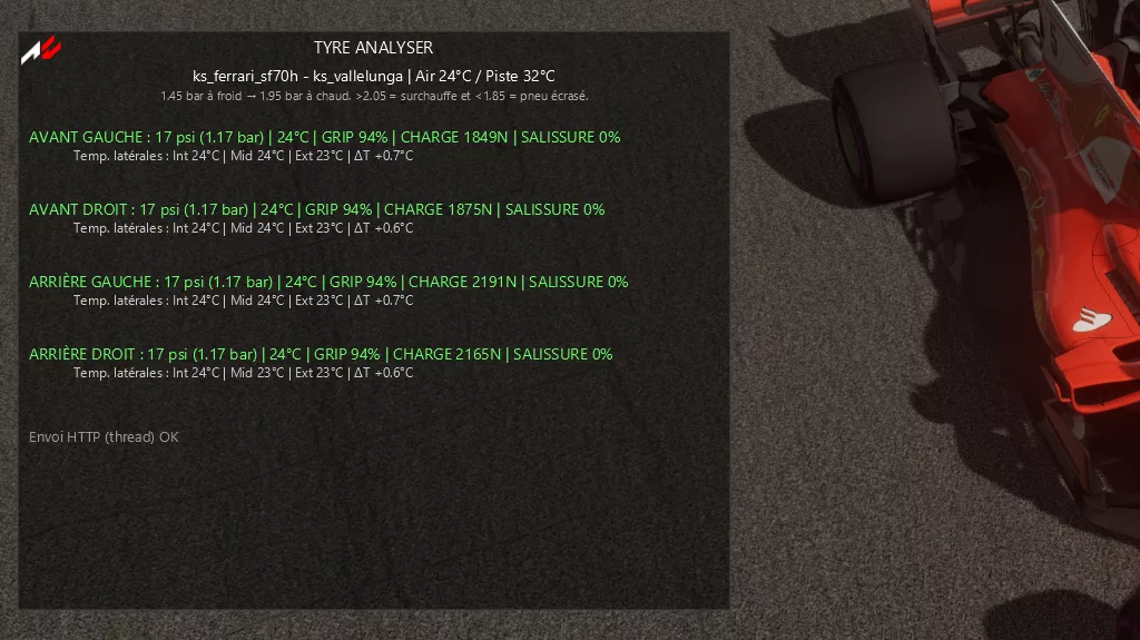 Notre application Tyre Analyser ne lit pas directement la “pression idéale” dans Assetto Corsa, mais la déduit à partir du comportement réel du pneu. En observant la température interne dit “core”, la stabilité du GRIP %, la vitesse d’échauffement et l’équilibre avant/arrière, l’application identifie si la pression est trop élevée ou trop faible. Une pression trop haute rigidifie la carcasse et fait monter la température au-delà de 100 °C, tandis qu’une pression trop basse empêche le pneu d’atteindre la plage optimale de 65–100 °C. Tyre Analyser analyse ces tendances sur plusieurs virages et propose un ajustement simple, comme “+0.1 bar” ou “–0.2 bar”, correspondant à la pression qui maximise la stabilité thermique et le GRIP %, exactement comme le ferait un ingénieur en piste.